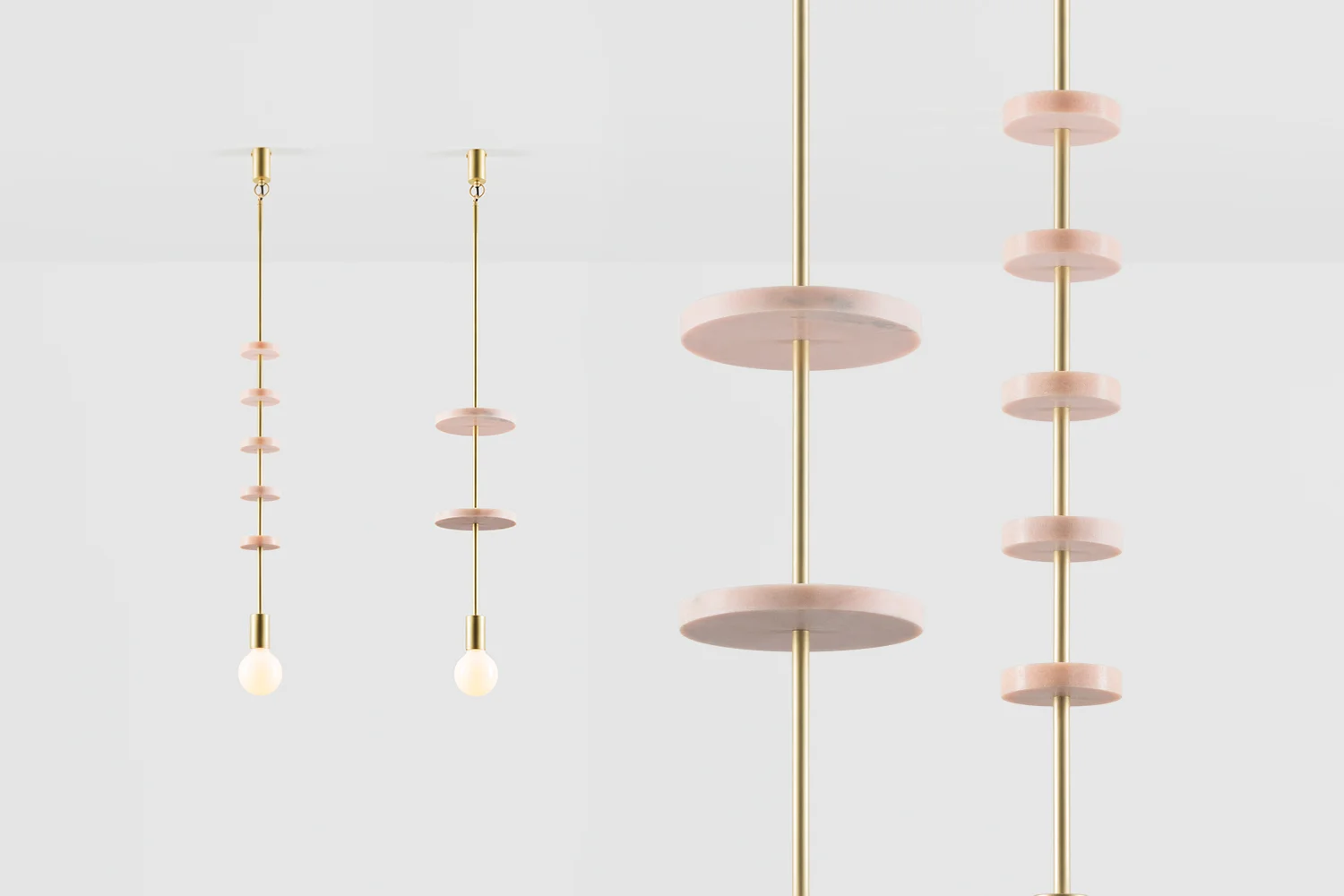 Volker Haug's 'Discus' pendants in polished or brushed brass with pink marble elements.